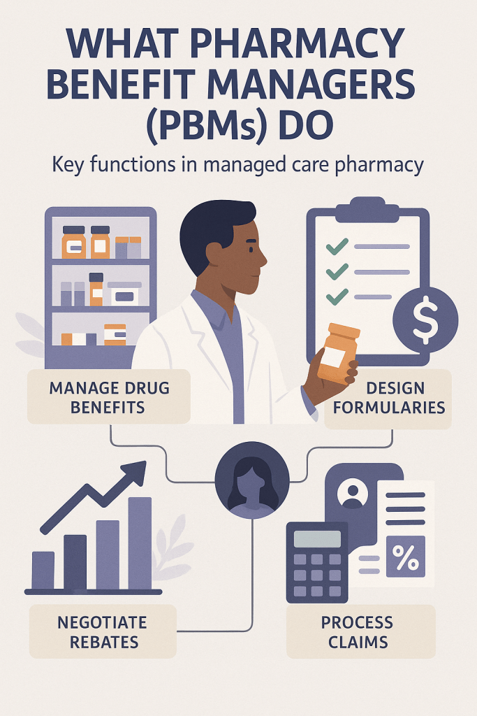 While Managed Care Organizations (MCOs) manage the full range of healthcare services — including medical, pharmacy, and other benefits — Pharmacy Benefit Managers (PBMs) focus specifically on administering the pharmacy benefit. PBMs are typically contracted by MCOs, employers, and government programs to help control drug costs, support appropriate medication use, and streamline pharmacy-related operations. They act as the middle layer between drug manufacturers, pharmacies, and health plans. Their key responsibilities include creating and managing drug formularies, negotiating rebates and discounts, and implementing tools like prior authorizations, step therapy, and quantity limits to ensure safe, cost-effective prescribing. PBMs also manage pharmacy networks and determine members’ out-of-pocket costs at the pharmacy.