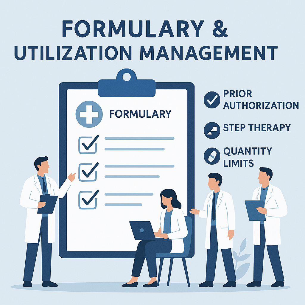 Formulary management involves building and maintaining a list of covered medications based on clinical effectiveness, safety, and cost. Pharmacists collaborate closely with physicians and other experts through Pharmacy & Therapeutics (P&T) Committees to review clinical trial data, real-world evidence, and therapeutic alternatives. Utilization management (UM) complements this work by ensuring that medications are used appropriately and efficiently. Common UM tools include prior authorization (requiring clinical criteria before a drug is approved), step therapy (trying a preferred drug first), and quantity limits (restricting supply to promote safe use). Together, formulary and UM strategies support high-quality care, avoid unnecessary costs, and help protect patients from potentially inappropriate therapies.